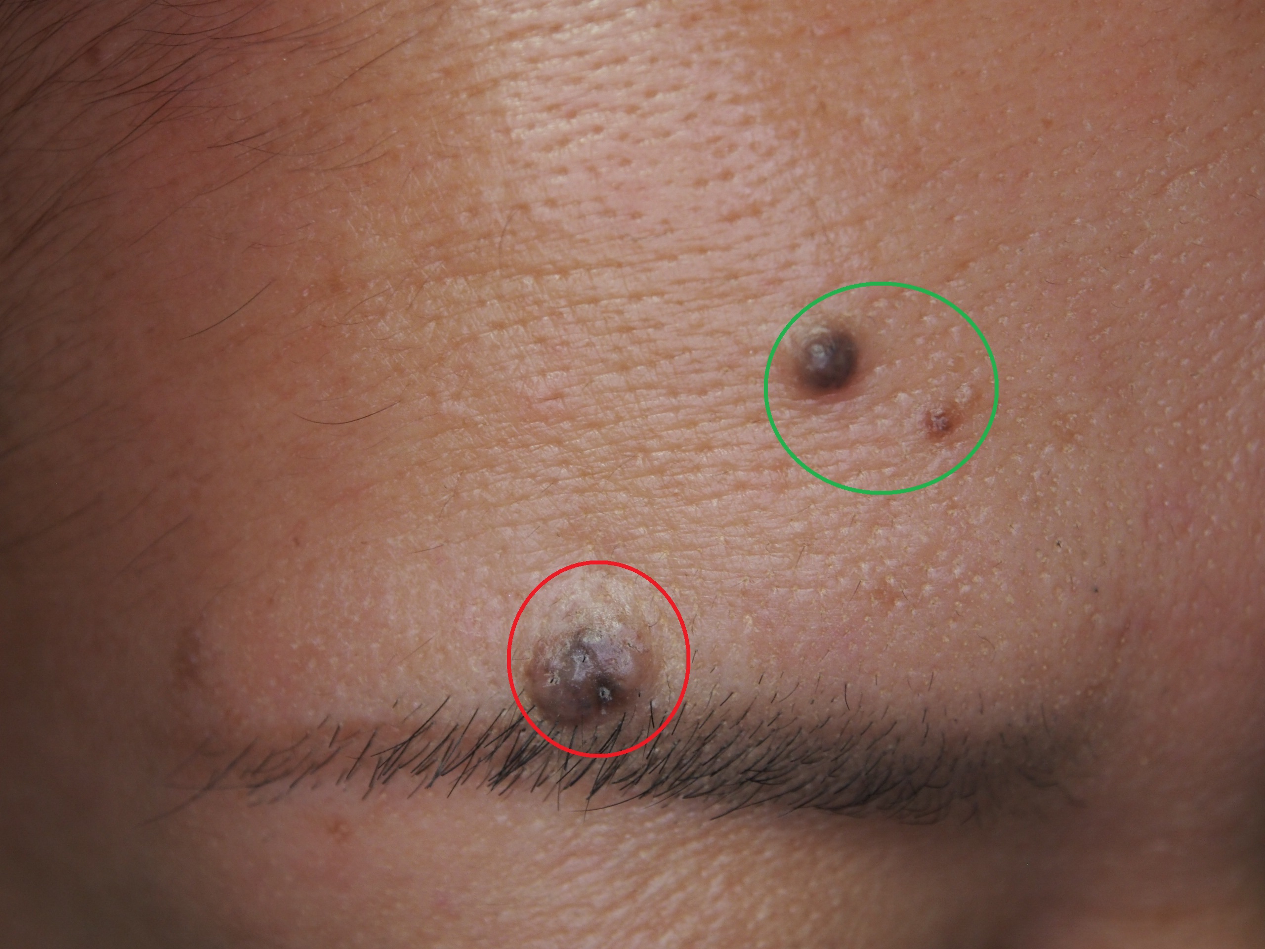 緑枠の小さいサイズのホクロは 炭酸ガスレーザーで除去しています。