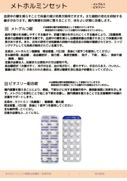 当院では、ニキビやシミなどのお肌悩みや、AGA、ダイエットサポートなど、多様な内服を処方しています。